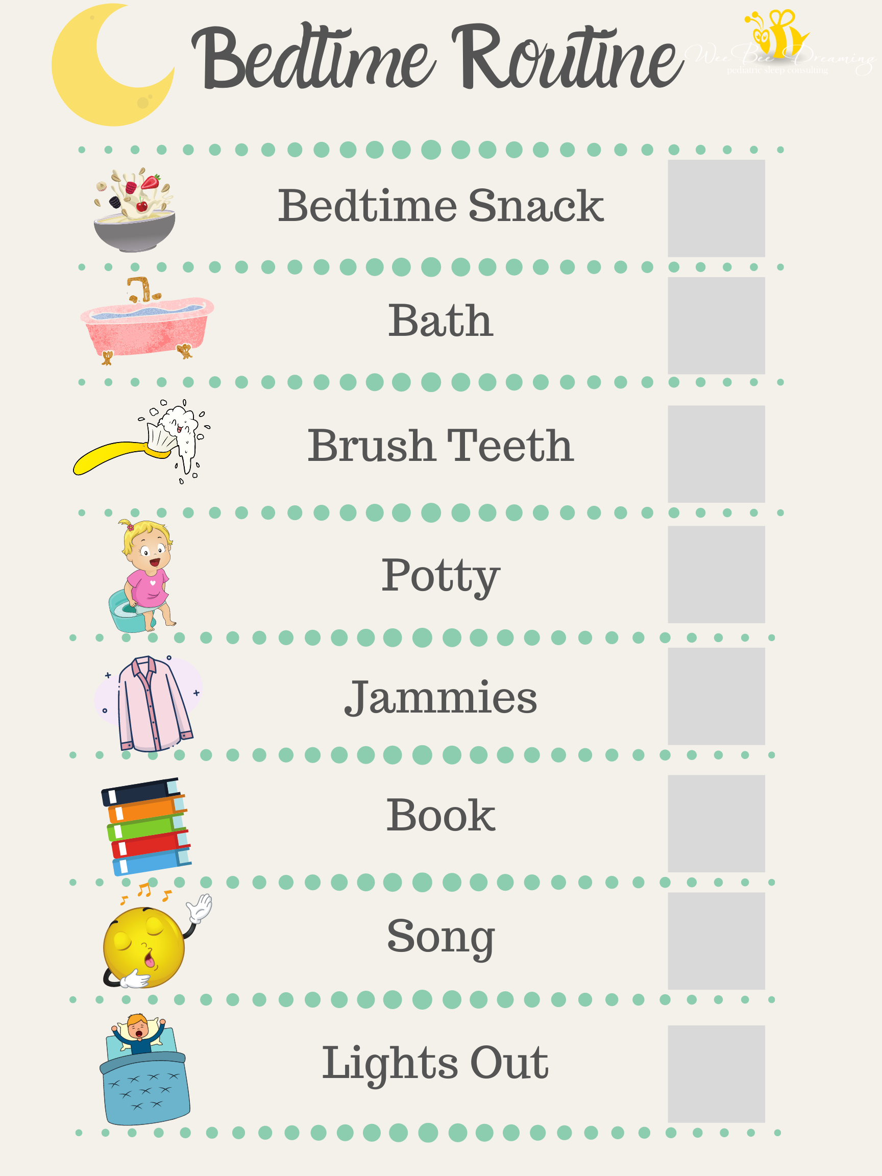Make sure going pee is the very last step in your bedtime routine. Even if that means leaving the room again after reading books, etc. to use the bathroom, having it as the last step is a good strategy. You may even want to consider ‘double dipping’ – pee at the start of the routine and pee again at the end!